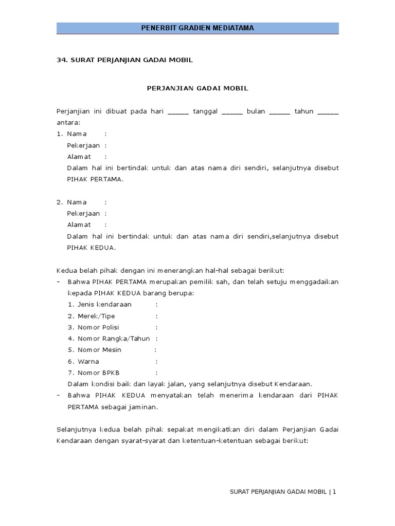 Surat perjanjian gadai sangat penting dalam proses gadai mobil tanpa BPKB. Surat perjanjian ini berisi ketentuan-ketentuan yang harus dipatuhi oleh kedua belah pihak. Dalam surat perjanjian ini terdapat informasi mengenai jumlah pinjaman, jangka waktu, dan juga bunga yang harus dibayar.